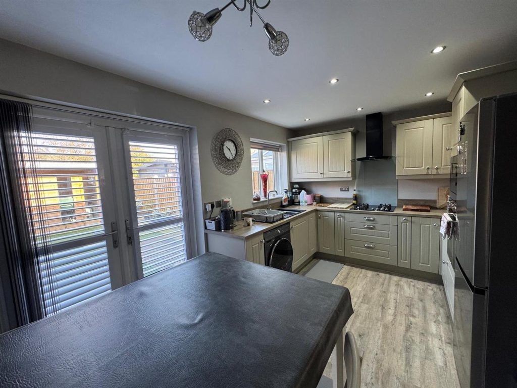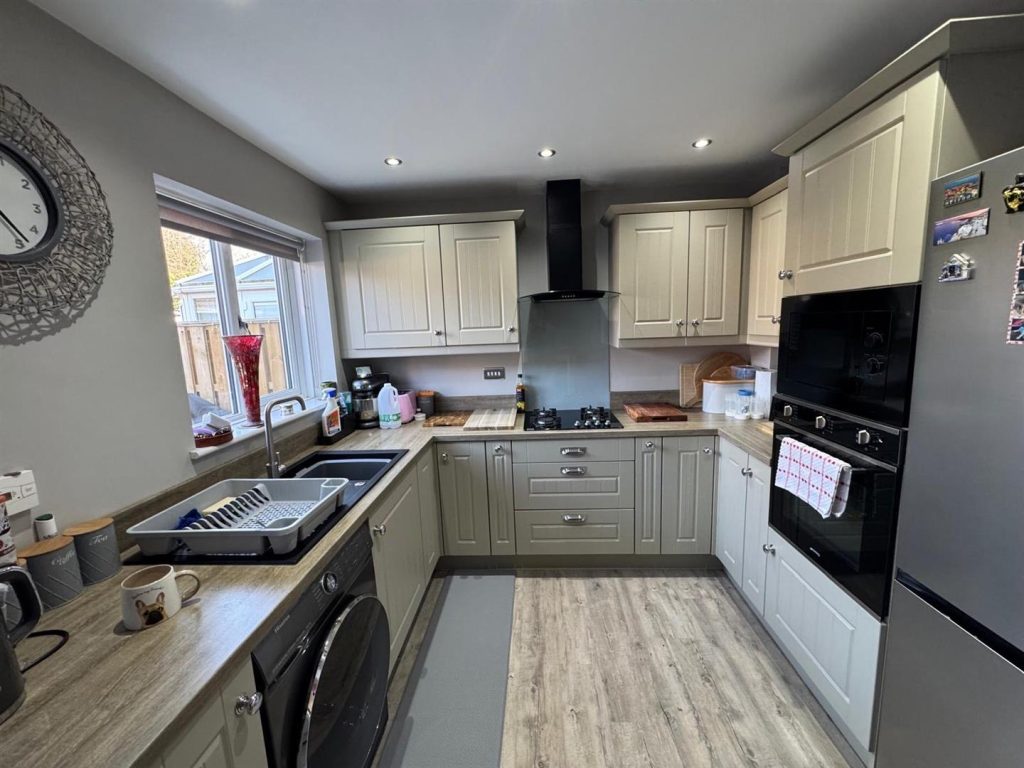 Fitted with a good range of wall and base units with complimentary work surfaces and splash back. Integrated oven , gas hob, microwave and extractor over. Plumbing for washing machine. Spotlights. Radiator and patio doors to rear garden.